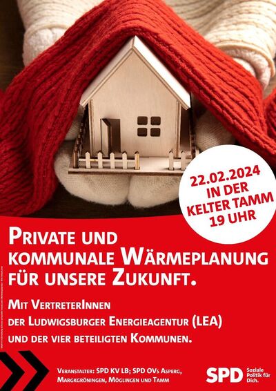 Große Unsicherheit herrscht bei den Bürgerinnen und Bürgern unserer Gemeinden bei der Frage, wie wohl die Wärmeversorgung in den nächsten Jahren und Jahrzehnten aussehen soll. Die Stadtverwaltungen und Gemeinderäte beschäftigen sich mit der kommunalen Wärmeplanung und der kommunalen Klimaneutralität. Auch hier gibt es viele ungelöste Probleme. Die SPD-Ortsvereine Asperg, Markgröningen, Möglingen und Tamm sowie der SPD-Kreisverband Ludwigsburg wollen versuchen, auf einer Veranstaltung dazu Antworten zu geben: